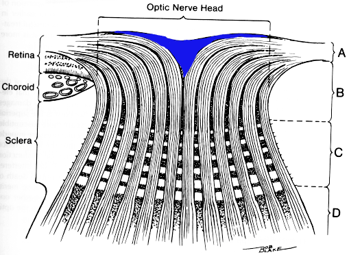 The blue shading represents the optic disc cup in cross section